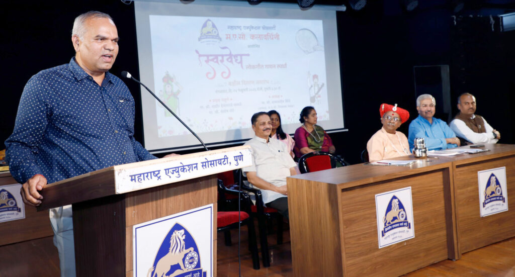 अध्यक्षीय भाषणात बाबासाहेब शिंदे म्हणाले की, आजच्या जागतिकीकरणाच्या काळात आणि नवतंत्रज्ञानाचा उदय होत असताना लोककलांचा विसर पडू नये म्हणूनच महाराष्ट्र एज्युकेशन सोसायटीने या स्पर्धा आयोजित केल्या आहेत. असे वेगळ्या स्वरुपाचे उपक्रम आयोजित करणे हे ‘मएसो’चे वैशिष्ट्य आहे. विद्यार्थ्यांच्या सर्वांगीण विकासासाठी अवांतर वाचन आणि विविध कलागुणांची आवश्यकता असल्याने नव्या राष्ट्रीय शिक्षण धोरणामध्ये क्रमिक अभ्यासक्रमाबरोबरच कलागुणांना महत्व देण्यात आले आहे. जे सहज सादर होते ते लोकगीत. शाहीर, लोककलावंत हे संस्कृतीचे वाहक असतात. लोकगीतांनीच आजपर्यंत पिढ्या घडल्या आहेत आणि संस्कृती प्रवाही राहिली आहे.